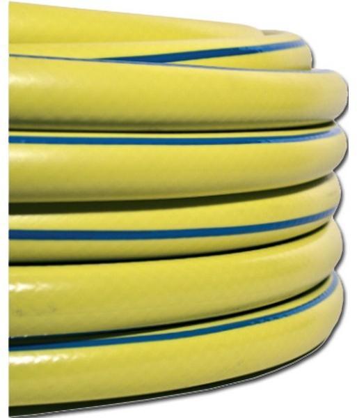 Záhradná hadice 3-vrstvová SUNFLEX . Vyrobená z mäkčeného PVC. – 1.vrstva – vnútorná vrstva z čierneho PVC, odolná proti UV žiareniu a ukladanie rias v hadici. – 2.vrstva – pletená krížová syntetické vlákna – 3.vrstva – vonkajšie, žltá transparen.
