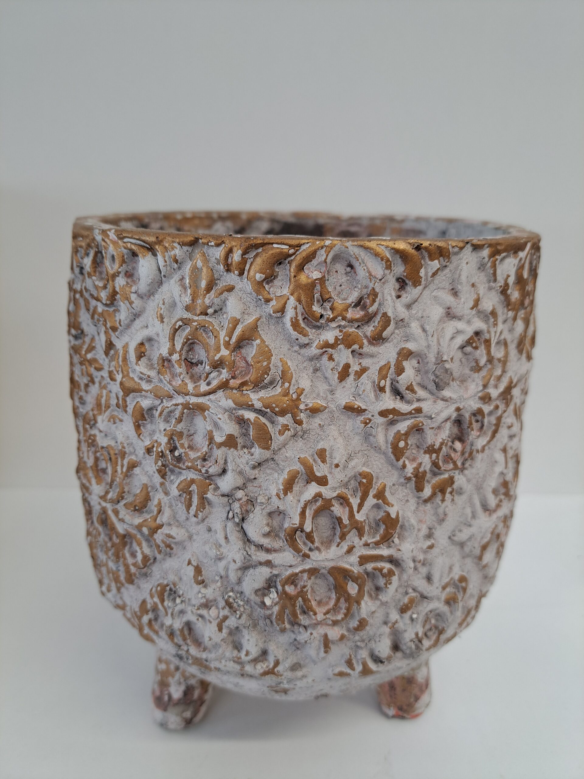 Keramický vintage obal s krásnou zlato-betónovou textúrou je zaujímavým doplnkom vďaka 3 nožičkám na ktorých stojí.