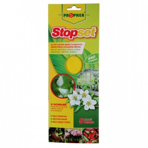 STOPSET Žlté lepové dosky 5 ks slúžia na odchyt škodlivého hmyzu, ako sú molice, smútivky, vrtivky, lietajúce imága vošiek, skočky, minérky, strapky, nosániky., v záhradách, sadoch, skleníkoch, bytoch, v skladoch ovocia a zeleniny a pod. Źlté lepové dosky Stopset sa používajú aj na odchyt vrtivky čerešňovej, spôsobujúcej červivosť čerešní. Dosky vyveste na slnečnej strane stromov v období, keď sa plody začínajú farbiť nažlto. Na upevnenie dosiek použite špagát a vyveste ich tak, aby lepová plocha bola vodorovne so zemou, pretože vrtivka čerešňová nalietava na lapače predovšetkým zospodu. Zloženie: nevysychavé lepidlo Chemstop Ecofix na inertnom plastovom nosiči žltej farby.